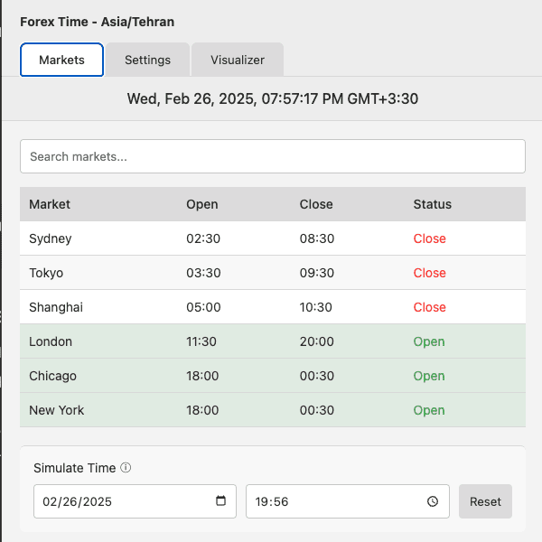 نمایش باز و بسته بودن بازارهای مالی در لحظه